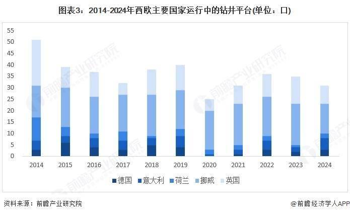 随着欧洲对于环保要求的不断提高,钻井平台的设计和运营也越来越关注深海生态保护和可持续性问题。深海科技在这一方面的应用非常重要,尤其是在环境监测和资源开采后废弃物处理方面。受制于环保和成本,西欧主要国家德国、意大利、荷兰、挪威、英国五个主要有海洋钻井实力的国家近年来钻井平台数量波动下降。2014年五国的钻井平台数仍有51口,到了2024年钻井平台数下降至31口。五国中挪威数量最多,从2014年占比27.5%增长到2024年的41.9%。